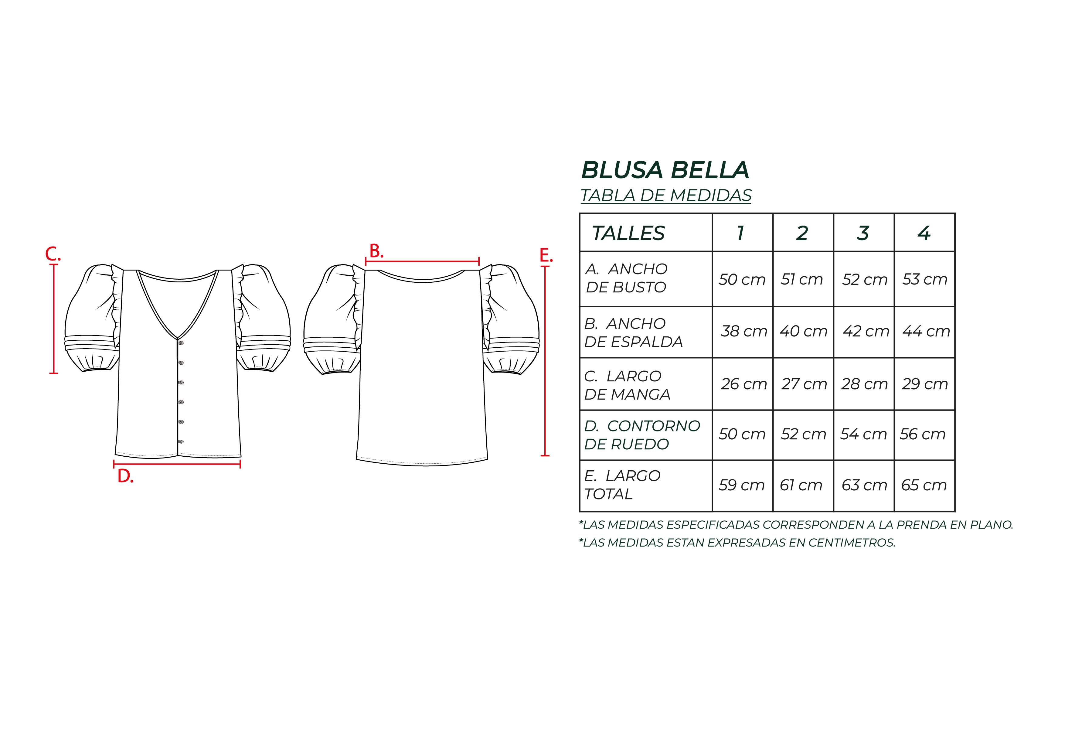 Blusa corte regular, recto con escote en V. Mangas cortas globo con volado en el hombro y tablas, con frunce generado por una terminación elastizada en la bocamanga. El acceso de la prenda se genera por una abertura central total, con gotas y botones personalizados a tono. El largo modular de la prenda se extiende por debajo de la primera cadera.