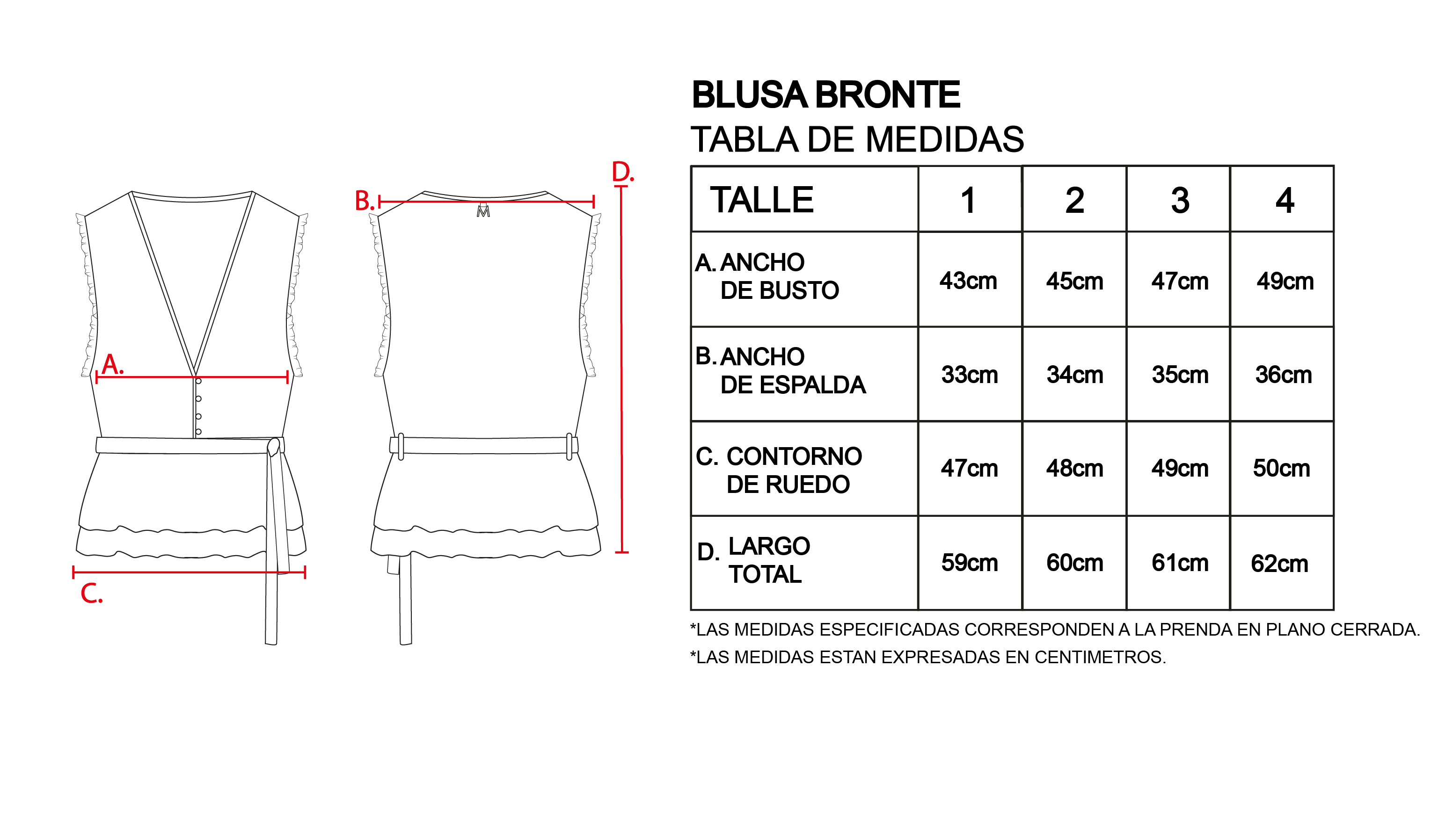 Blusa escote en V, con cartera central con botones de diseño metálicos con cristal. El delantero está totalmente forrado. Posee dos maxi volados tipo faldones al corte con elástico en la cintura. Lleva pasacintos con un lazo para atar y regular. El largo modular de la prenda se extiende por debajo de la primera cadera.