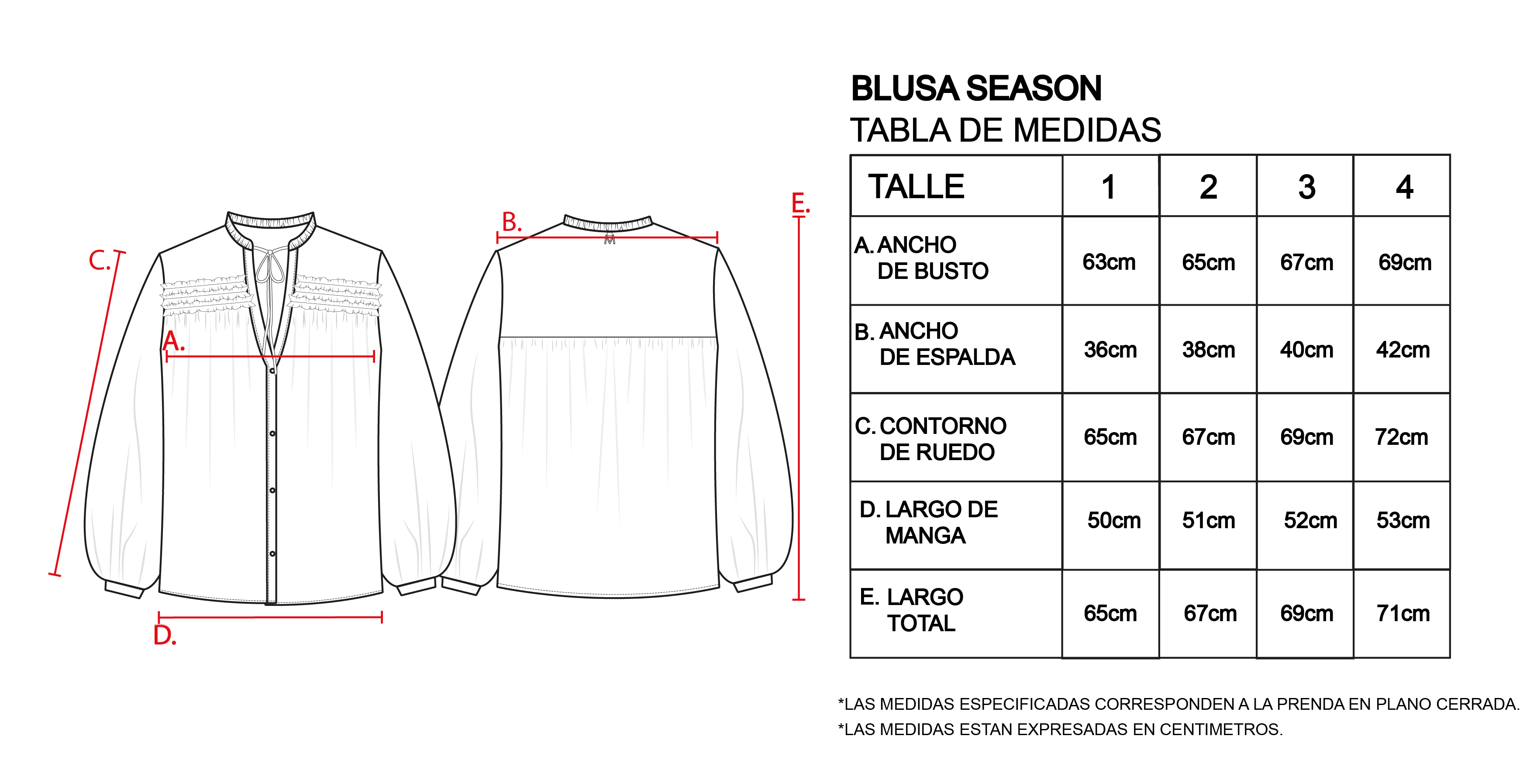 Blusa de corte regular y holgado. Con escote en V con tirilla para atar tipo lazo. Mangas 3/4 con frunce central con terminación elastizada en la bocamanga. El acceso delantero es mediante una cartera simple abotonada con botones a tono personalizados. En hombros y espalda posee un canesú con frunce por debajo. El largo modular de la prenda se extiende hasta la primera cadera.
