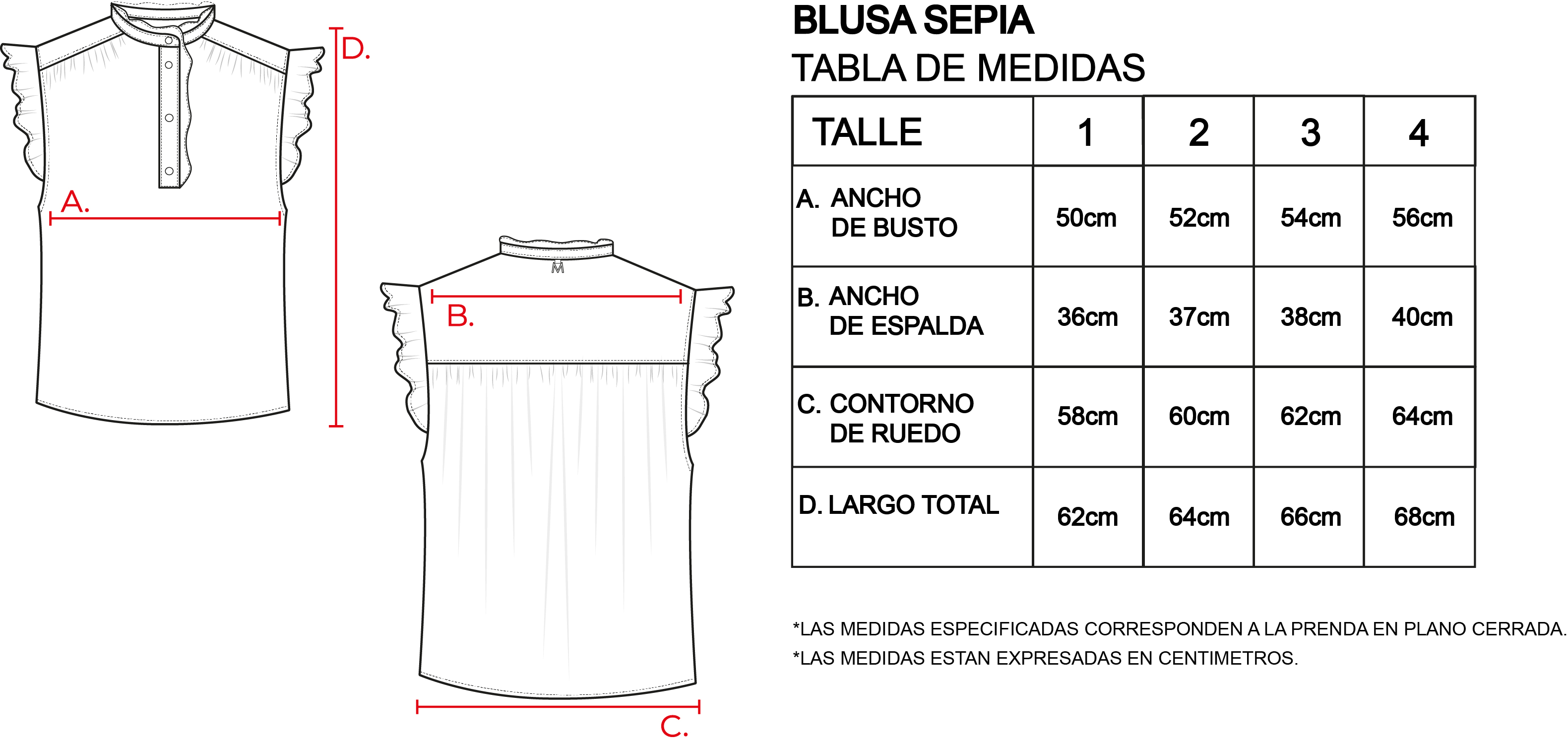 Blusa corte regular recto y terminación curva en el bajo. Posee una cartera delantera fija con botones a tono personalizados y un volado que acompaña el recorrido hasta el cuello. Lleva volados en los hombros. El largo modular de la prenda se extiende por debajo de la primera cadera.