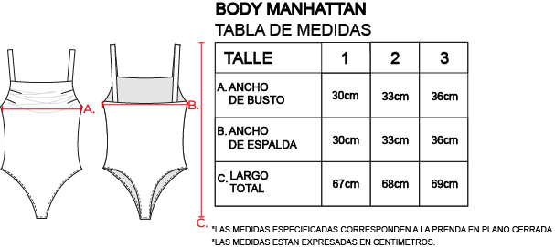 Body con escote recto, sin mangas. Detalle de tablas horizontales en el busto. Breteles anchos, bajo con terminación colaless con gancho. Integramente forrado.