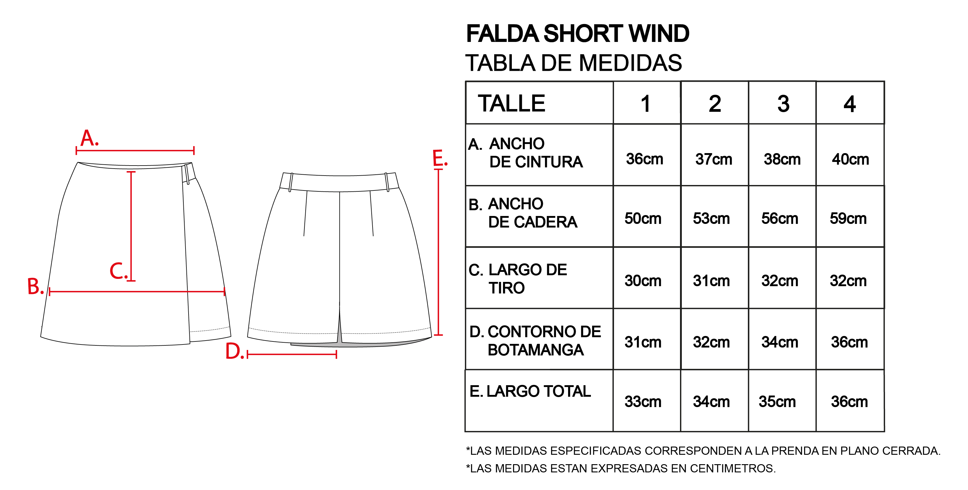 Falda short tiro medio. El acceso es mediante un cierre invisible lateral. Posee pasacintos..