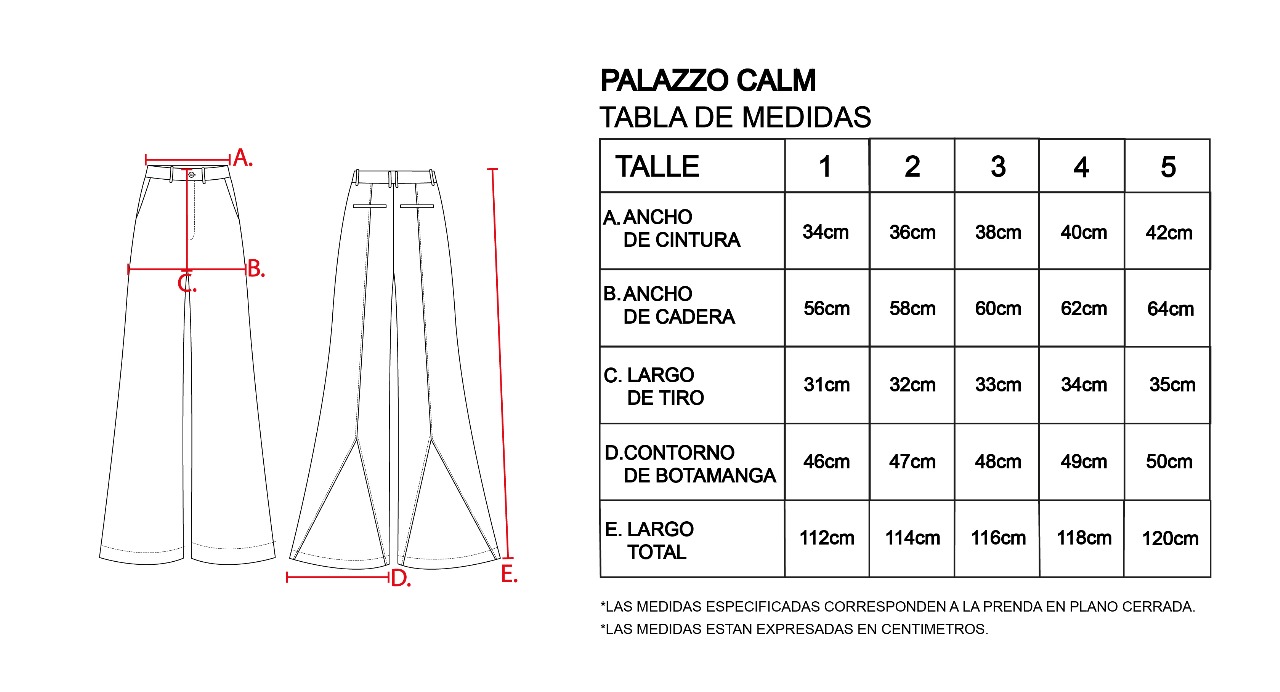 Pantalón de textil suave y texturado, tiro alto, con bolsillos. Su acceso es mediante una cartera con cierre delantero y pretina abotonada con botón personalizado. El largo modular de la prenda se extiende hasta el talón aproximadamente. Las botamangas poseen una gran amplitud con un recorte en la bocamanga trasera. El textil tiene un print diseñado exclusivamente por Malabia.