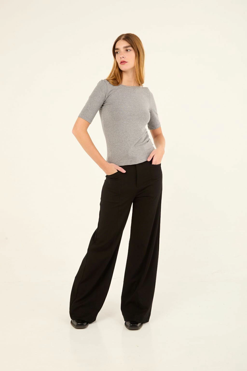 Remera con escote redondeado, mangas ¾ por encima del codo. El escote de la espalda es redondeado y profundo. El largo modular de la prenda se extiende hasta la primera cadera, la espalda tiene un largo irregular, más extenso que el delantero.