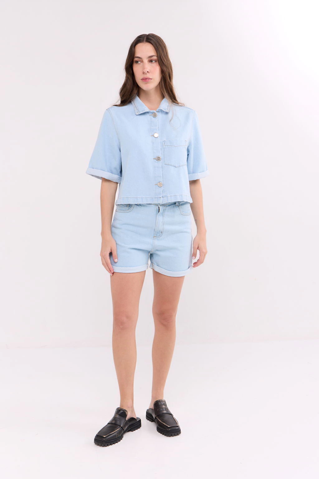 Short tiro alto de calce recto. En la espalda lleva bolsillos plaqué. El bajo posee una terminación con doblez plegado. Posee badana de PU, y remaches y botón personalizados de zamak.
