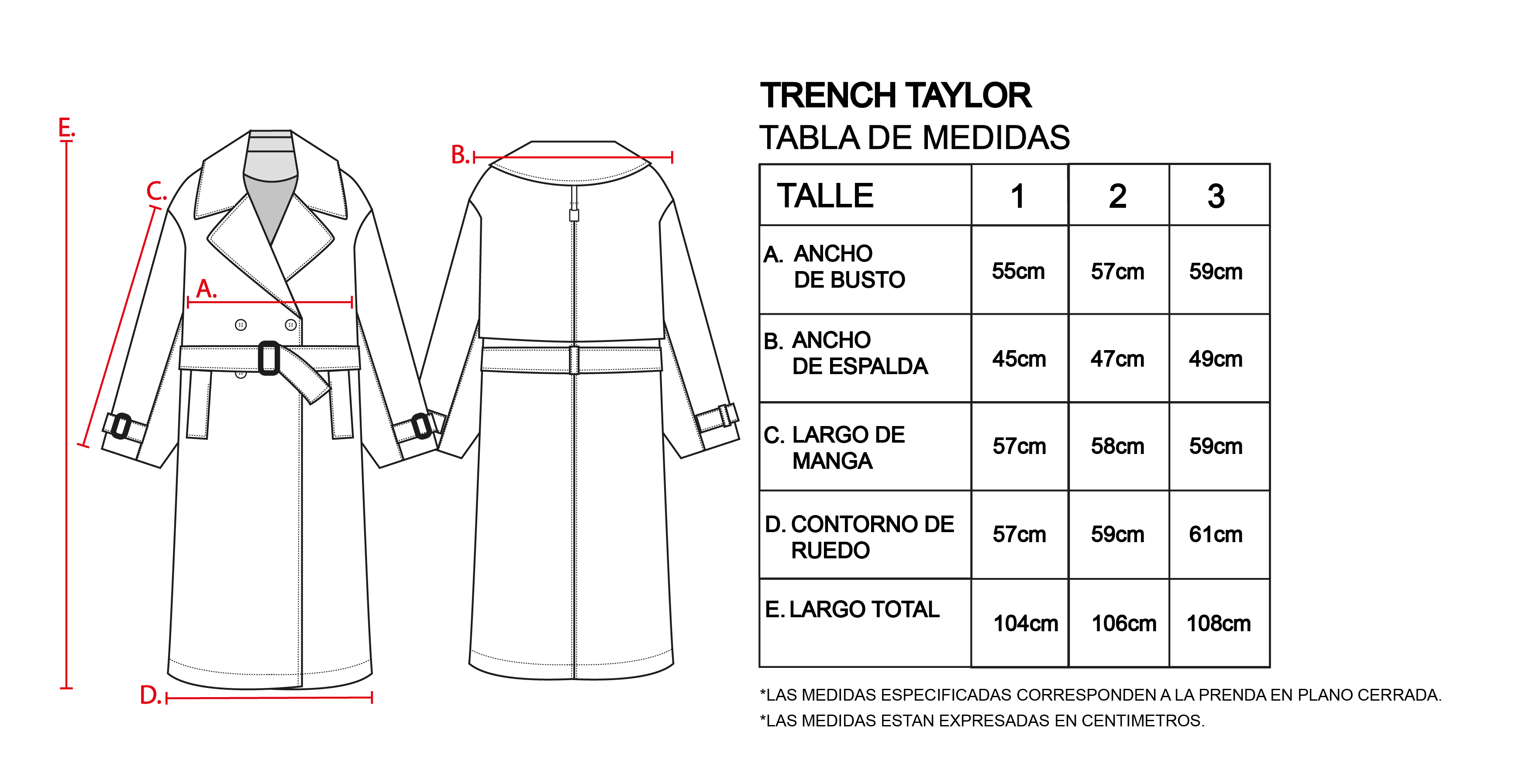 Abrigo tipo trench largo, con maxi solapa en cuello. Su acceso es mediante una cartera con doble cruce con botones de carey personalizados. Posee bolsillos laterales. El largo modular de la prenda se extiende por debajo de la rodilla. Tiene tiras regulables en los puños, un cinturón desmontable, ambos con hebillas de carey. En la espalda posee un bordado floral con hilo a tono y pedrería diseñado exclusivamente por Malabia.