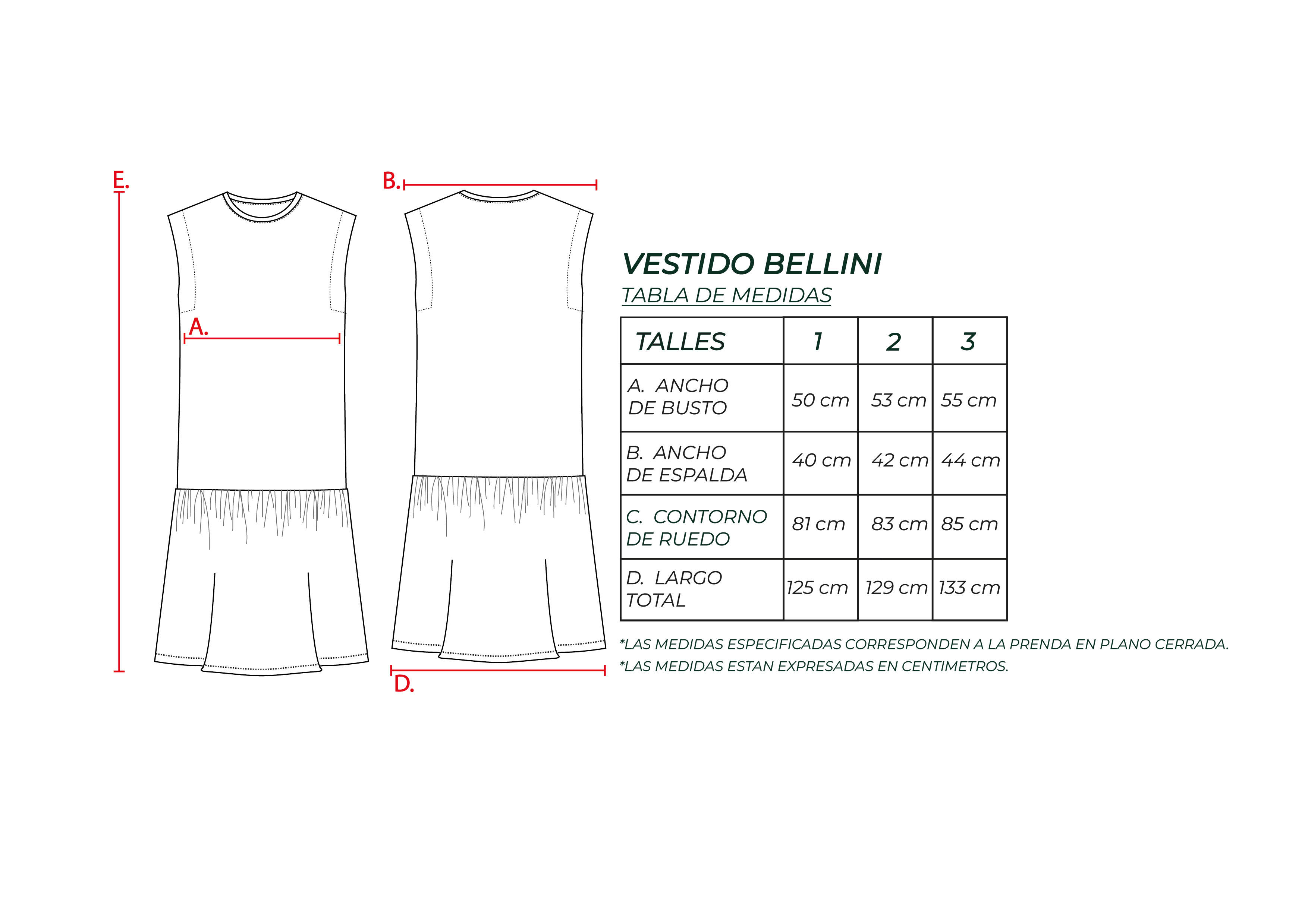 Vestido escote en redondeado a la base, sin mangas y con hombros levemente caídos. Amplio y con soltura, la falda posee un maxi volado inferior. El largo modular de la prenda es a la altura de la pantorrilla aproximadamente.